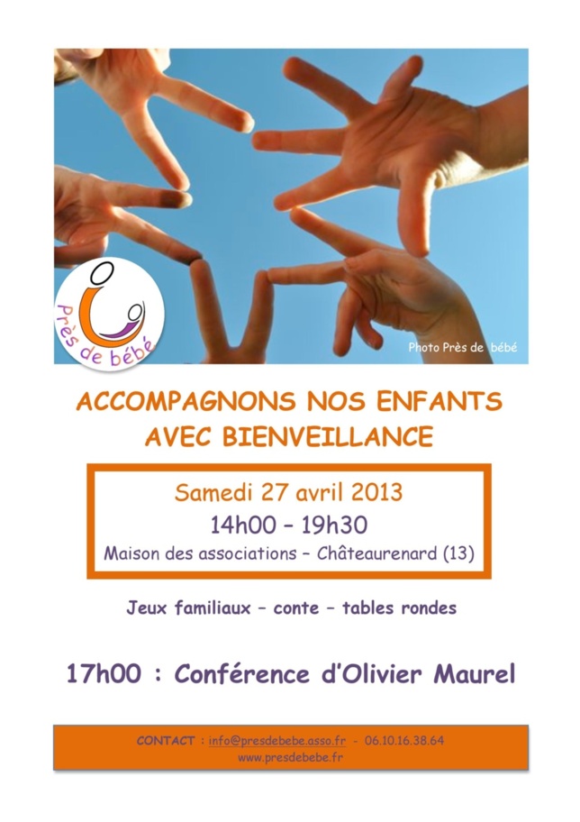Le mardi 30 avril à partir de 14h, autour d'un goûter, je vous propose de nous rencontrer (parents, grands-parents, assistantes maternelles, baby-sitter,....) pour vivre un moment d'échange, partager, poser des questions, découvrir l'éducation non-violente et trouver ensemble des pistes pour accompagner nos enfants dans la bienveillance, sans violence physique ou psychologique.