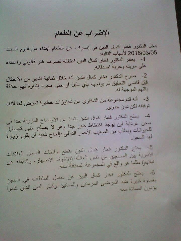 Nous lançons également un appel aux instances internationales à soutenir et à intervenir dans la situation grave dans laquelle se trouve le DR FEKHAR et ses compagnons."