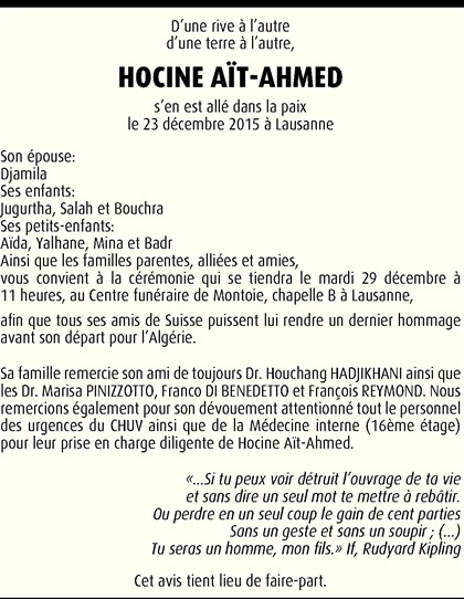 Faisant le déplacement depuis plusieurs villes européennes, des anonymes, des officiels ainsi que plusieurs personnalités politiques et des artistes ont pu présenter leurs condoléances et leur sympathie à Jugurtha Ait Ahmed, le fils du défunt qui tenu a préciser aux présents que "c'est un recueillement sur un héros national et qu'il faut que la rencontre reste dans son contexte prévu", chose qui a été respectée par toute l'assistance.