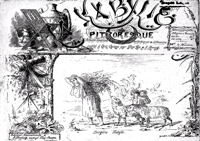 Couverture du premier numéro de la revue Kabylie pittoresque dans laquelle transparaît nettement l'influence de l'orientalisme français, notamment à travers les écritures en arabe et le nom même de la Kabylie calligraphié en arabesque ... (PH/BNF)