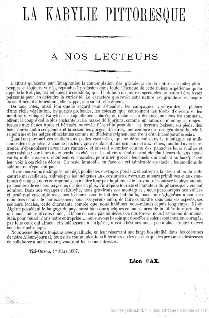 Aucune question politique ou administrative ne recevra asile clans les colonnes de la «KABYLIE PITTORESQUE. » Il en sera de même pour toutes les communications qui ne se rapporteraient pas à notre oeuvre dont le caractère est exclusivement artistique et littéraire.