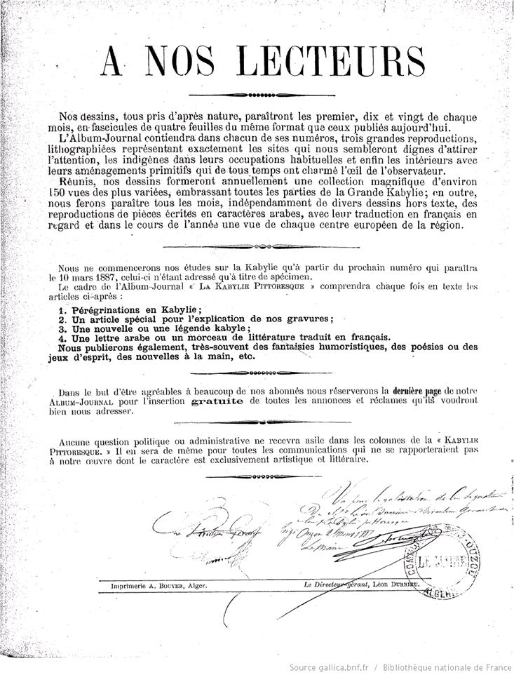 Dans nos voyages en Kabylie, nous gravirons ses montagnes ; nous parcourrons ses vallées et pénétrant ensemble avec nos lecteurs sous le toit des habitants, nous ne négligerons aucun des moindres détails de leur existence ; nous essayerons enfin, de faire connaître sous tous ses aspects, ses couleurs locales, cette charmante contrée que nous habitons nous-mêmes depuis longtemps. Né en Algérie possédant le langage du pays aussi bien que quelques connaissances de la littérature orientale qui nous aiderons sans doute, la tâche ne sera pas au-dessus de nos forces, nous l'espérons du moins. Mais pour réussir dans notre entreprise.... nous avons besoin que nos efforts soient soutenus, encouragés, par tous ceux qui aiment et s'intéressent à l'Algérie, aussi n'hésitons-nous pas à placer notre œuvre sous leur patronage.