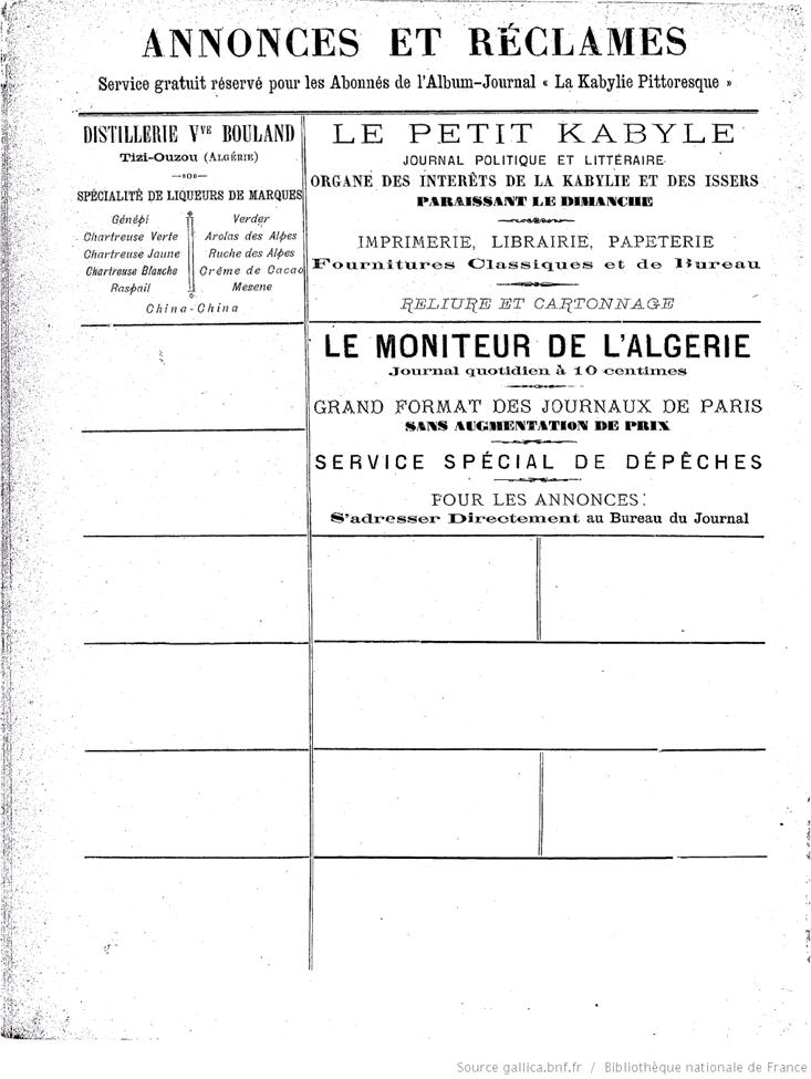 Dernière page du premier numéro de la revue " La Kabylie pittoresque"