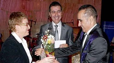Khalida Toumi offrant un bouquet de fleurs au chanteur Takfarinas