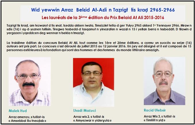 La troisième édition du concours Belaid At Ali, tout comme les 1ère et 2ème éditions, a connu un succès ou seize (16) auteurs ont pris part. Le concours s’est déroulé du juillet 2015 au 12 janvier 2016. Un jury est désigné et il est composé de 15 personnes extérieures à la fondation qui sont des hommes et des femmes du monde littéraire amazigh.