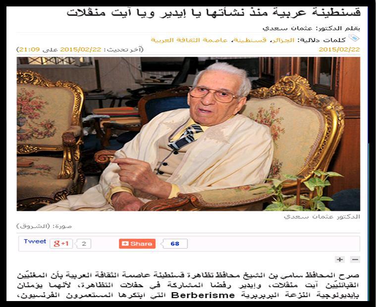 La folie furieuse de cet « intellectuel », et non moins digne représentant de la « splendeur arabe » de l’Etat algérien, a été étalée dans le journal kabylophobe El ChourouK, après que les chanteurs Idir et Ait-Menguellat aient refusé de participer aux festivités de « Constantine capitale de la culture arabe ». Ce journal, de même que son acolyte d’Ennahar, ouvertement racistes, islamistes, pro daechistes, ont coutume de commette des articles insultant vis-à-vis de la langue, la culture et l’identité amazighe, qu’ils jugent insuffisamment « civilisées », tant que celles-ci n’ont pas opéré un total reniement et une parfaite substitution.