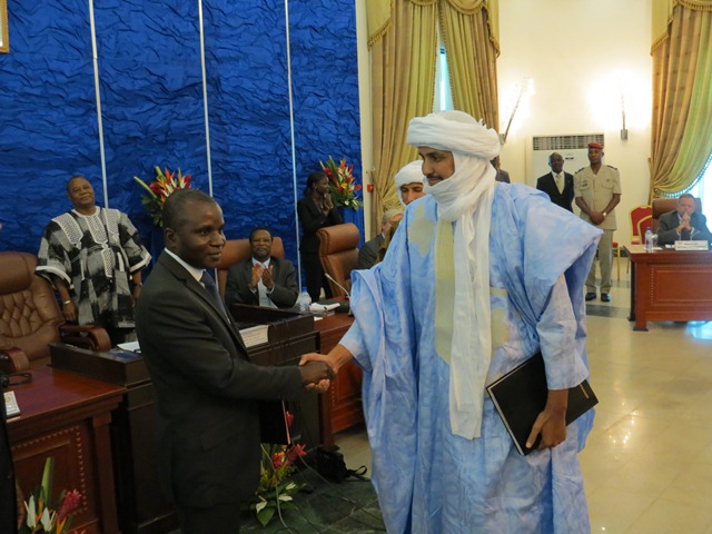 Signature des accords de Ouagadougou : Alghabass Ag Intalla, est le bras droit d’Iyad Ag Ghaly qui a mené l’attaque contre la ville de Kona et donc permis le déploiement de l’armée française au Mali et surtout dans l’Azawad. Grace à la diplomatie française, Alghabass Ag Intalla est revenu s’installer à la table des négociations sous le nouveau nom (HCUA) donné à l’organisation terroriste Ansar Dine, pourvu que le MNLA , seul à porter les aspirations indépendantistes du peuple soit noyé et à terme détruit.(PH/DR)