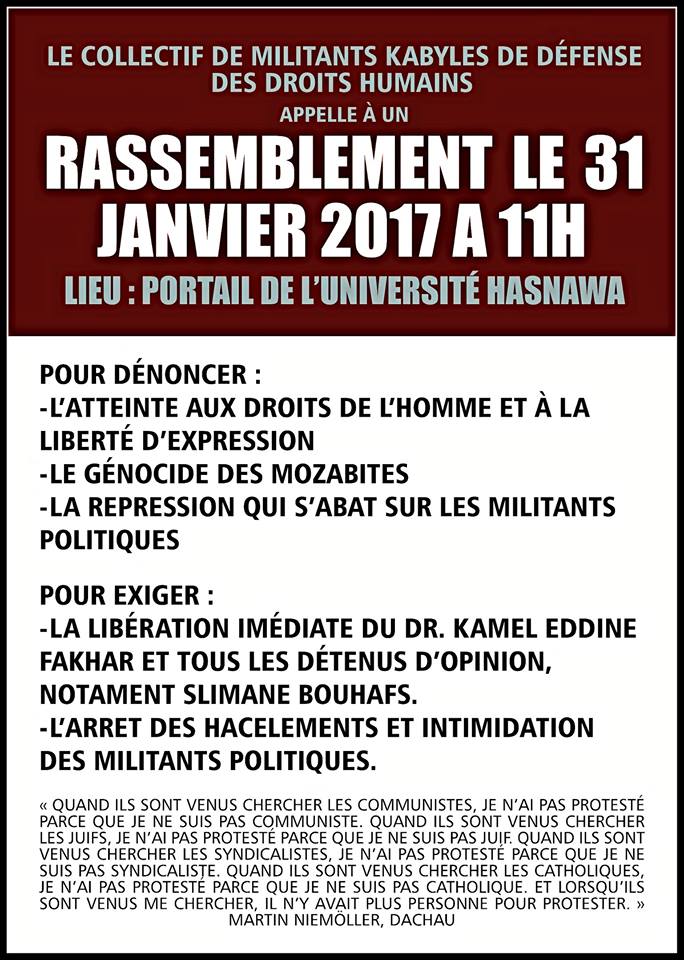Nous appelons les citoyens(ne)s soucieux des Droits humains à venir massivement au rassemblement qui aura lieu le mardi 31 janvier 2017 à 11h, au niveau du portail de l’université de Tizi‐Ouzou (Hasnawa).