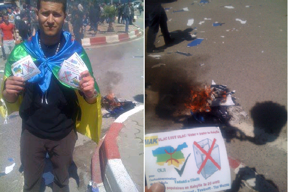 Les manifestants sont ensuite descendus jusqu’au rond-point, place des Martyrs du printemps noir, face au commissariat pour exiger la libération des étudiants qui ont été arrêtés. Les manifestants ont occupé le rond-point. Puis, le président du conseil régional du MAK, Djafar Khennane, a alors montré l’exemple. Il a arraché un poster à l’effigie de Bouteflika. S’en est suivi un grand nettoyage. Tous les manifestants se sont alors mis à déchirer tous les posters des candidats à cette mascarade politique et les ont symboliquement brûlés devant des policiers muets et immobiles. A la place de ces guirlandes de posters de figurants algérianites, les militant-e-s du MAK ont collé et distribué massivement les stickers appelant au rejet des élections algériennes et à l’autodétermination de la Kabylie. Ce qui est aussi à noter c’est l’enthousiasme dynamique et l’adhésion remarquable que les manifestants et les simples passants ont montré à l’égard de cette action. Ils réclamaient des affiches aux militants du MAK et des dizaines de personnes se sont joints aux MAKistes pour les coller.