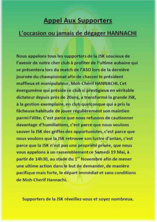 Les supporters et les anciens joueurs de la JSK rappellent « mener cette ultime action dans le but de demander de manière pacifique mais forte le départ immédiat et sans conditions de Moh-Chérif Hannachi ».