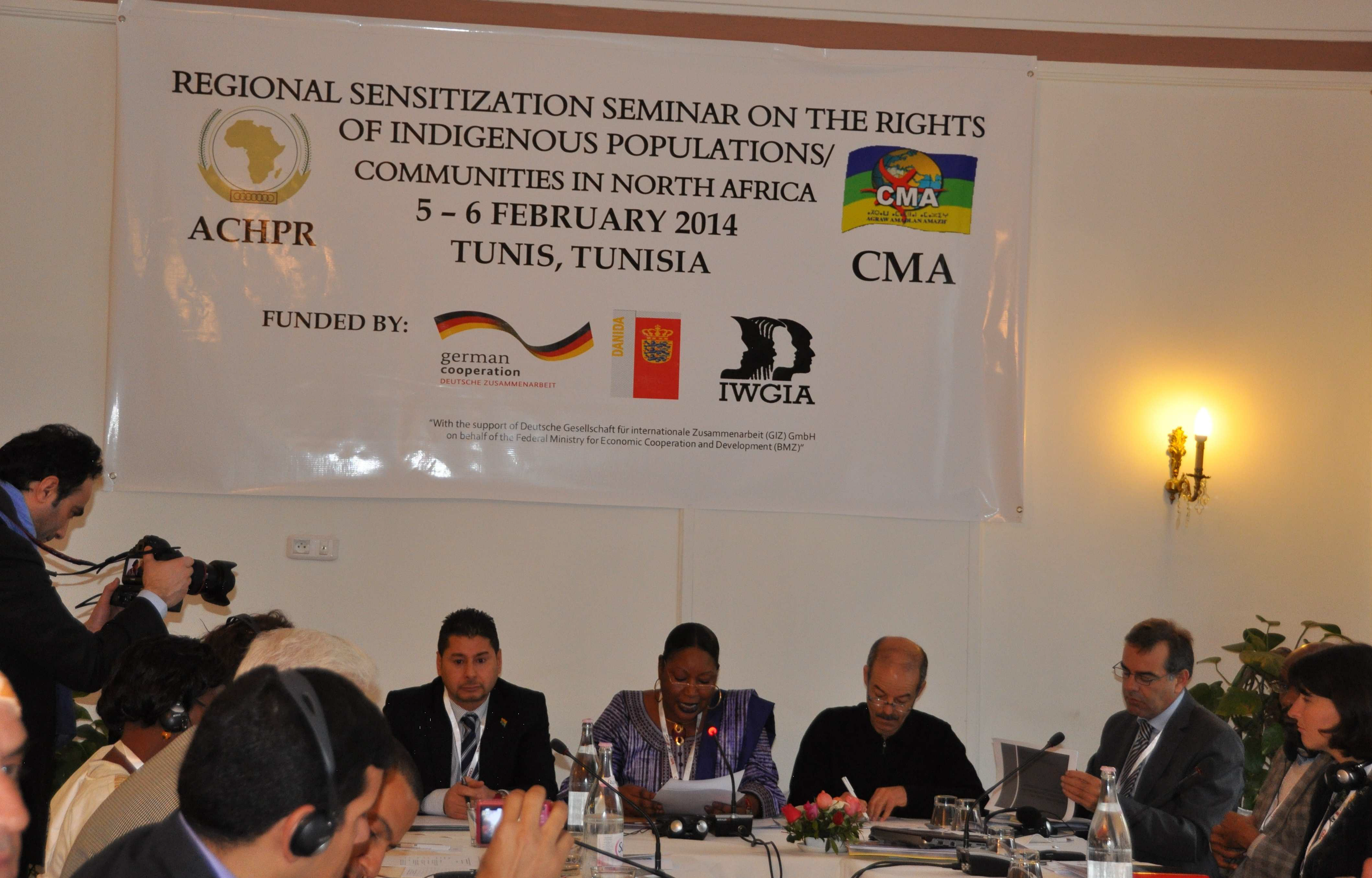 Deux experts des questions autochtones de l’Archipel Canarien et du Maroc ont également pris part à ce séminaire. La presse et notamment les médias amazighs, dont les chaines de télévision Berbère-TV et Ibraren de Libye, ont assuré la couverture médiatique de l’évènement. Mme Soyata Maiga a ouvert le séminaire le 5 février à 9h30 en exprimant sa joie de se trouver à Tunis et d’avoir l’opportunité de dialoguer avec les représentants des institutions nationales de droits de l’homme, les ONG et les représentants autochtones d’Afrique du nord dans le but de sensibiliser toutes les parties prenantes à la question autochtone. Elle a en outre précisé que ce séminaire sert à améliorer la connaissance des situations que vivent les populations autochtones dans cette région mais aussi à examiner les moyens et méthodes pour mieux assurer une plus grande collaboration avec le WGIP et la Commission Africaine afin de faire progresser les droits des peuples autochtones en Afrique du nord. Pour sa part, Fathi Nkhlifa, Président du CMA, après avoir souhaité la bienvenue à tous, a indiqué que cette rencontre se déroulait à un moment crucial pour les peuples autochtones d’Afrique du nord qui aspirent à vivre dans des Etats qui respectent leurs droits. Il citera pour le déplorer, l’exemple de la Tunisie qui vient de se doter d’une nouvelle Constitution qui ignore totalement l’existence des Amazighs de ce pays et leurs droits fondamentaux.