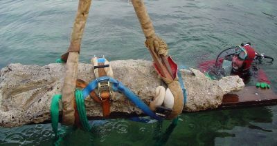 Après avoir été dégagée du fond, la statue a été préparée pour des manoeuvres et un transport délicat .