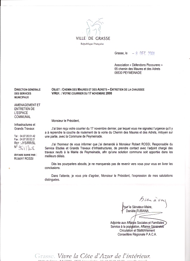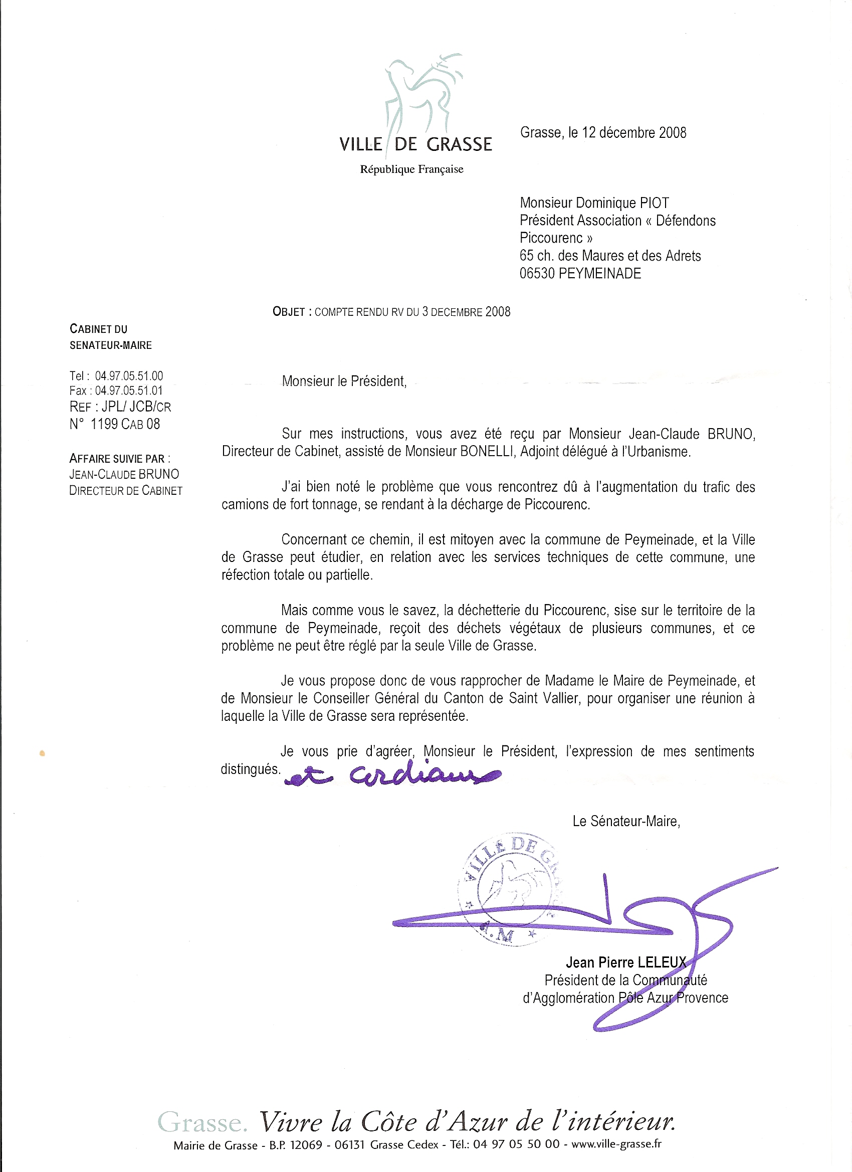 Vous trouverez ci-joint le compte de l'Assemblée Générale qui s'est tenu le 28 Mars 2008. Ce document décrit en détails toutes les actions entreprises par Défendons Piccourenc durant l'année 2008. Vous trouverez également tous les courriers importants, lettres et compte rendus de réunion, notamment le compte rendu de la dernière CLIS du site de Bio-Traitement opéré par VEOLIA. Si vous etes adhérent, il est important que vous nous aidiez à mobiliser le quartier. Incitez vos amis et voisins à nous communiquer leur adresses internet, pour que nous puissions communiquer avec le plus grand nombre de personnes. C'est moins cher que le courrier et plus rapide. Nous allons organiser une réunion à la rentrée pour permettre à un plus grand nombre de personnes de participer directement aux actions de l'association et de décider de ce que doit être notre action. Soyez à l'écoute ! Alors que de nouvelles menaces pèsent sur notre quartier, extension du site VEOLIA, et donc fatalement plus de camions, rapatriement des déchets verts de la Glacière sur Piccourenc, vente d'un terrain de 10000m2 avec la mention " base idéale pour toute activité dites à nuisances ", etc etc A tout moment vous pouvez nous contacter en utilisant ce site. Les messages laissés sur ce site, sont automatiquement transférés sur notre messagerie privée, et nous pouvons vous répondre sous quelques jours. donc n'hésitez pas à communiquer. Le Bureau de "Défendons Piccourenc!" vous souhaite bonne lecture, Cliquez sur les documents suivants pour lire ou télécharger.