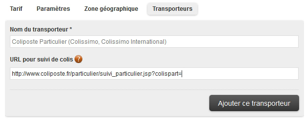 Ajoutez le nom de transporteur utilisé, puis l'url de tracking associé à ce transporteur.