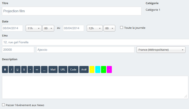 Vous pouvez ensuite ajouter une description afin de donner des informations supplémentaires, passer l'évènement dans les modules de News, publier l'évènement dans Google Agenda.