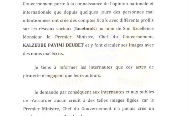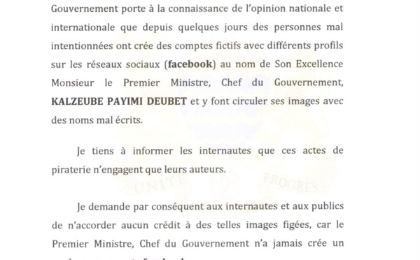 Un communiqué de presse signé du Directeur du Premier ministre attire l'attention sur la circulation sur le net d'une...