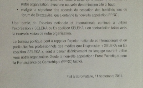 RCA : Décision n°4 du FPRC (Communiqué)