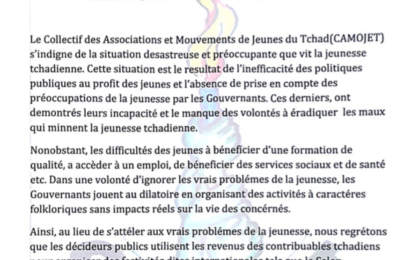 Le Collectif des Associations et Mouvements de Jeunes du Tchad (CAMOJET) s'indigne de la situation désastreuse et...