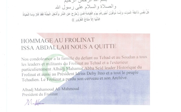 Le FROLINAT rend hommage à Issa Abdallah, dans un communiqué dont Alwihda Info a reçu une copie.