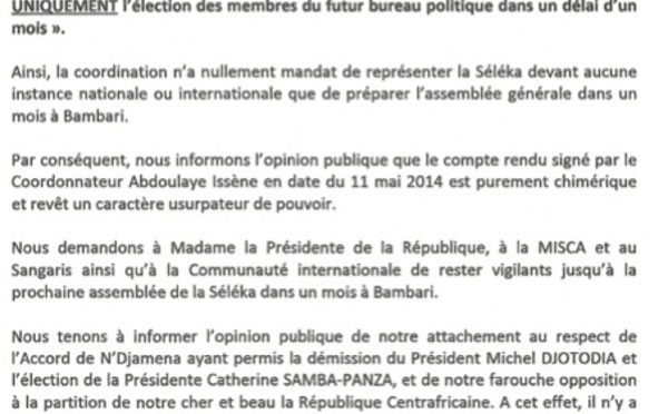 Dans un communiqué parvenu à Alwihda Info, la coalition Séléka dénonce un "compte rendu chimérique de la Coordination...