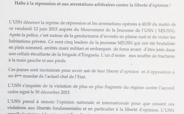 Communiqué de presse de l'USN en date du 12 juin 2015 : Nous prenons la communauté nationale et internationale à témoin...