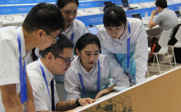 Volunteers work at the Media Center of the 11th G20 summit in Hangzhou, capital city of east China's Zhejiang...