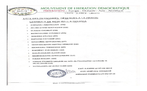 LE MOUVEMENT DE LIBERATION DEMOCRATIQUE ( M L D ) DEMANDE LA LIBERATION DES PRISONNIERS CENTRAFRICAINS A LA PRISON CENTRALE DE NEW BELL AU CAMEROUN