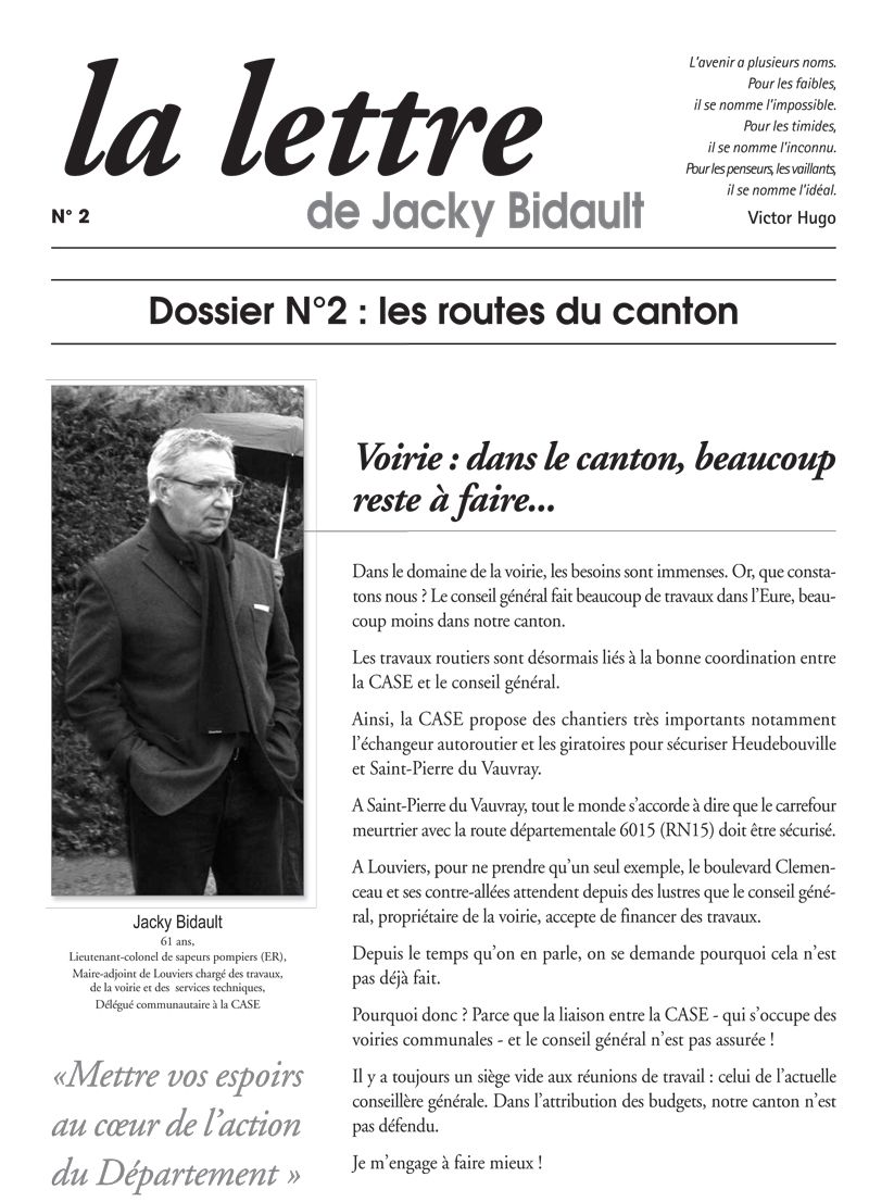 Sans coûter plus cher, en noir et blanc, les "Lettres" du candidat Bidault et de sa suppléante, Anne-Marie Ashbrook sont élégamment mises en page, claires et agréables à lire.