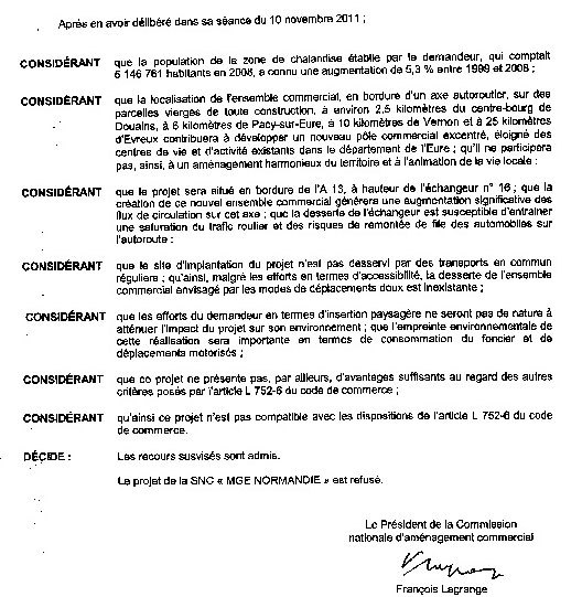 Après avoir écouté nos arguments, la Commission Nationale d'Aménagement Commercial a refusé l'implantation de Mac Arthur Glen sur le site de Douains. Il me semble intéressant de publier cette décision de la CNAC, qui a surtout retenu nos objections portant sur le plan environnemental : commerce excentré, éloigné des centres de vie et d'activité, danger de remontée de file sur l'autoroute, absence de modes de déplacement doux, etc.Nouveau commentaire :