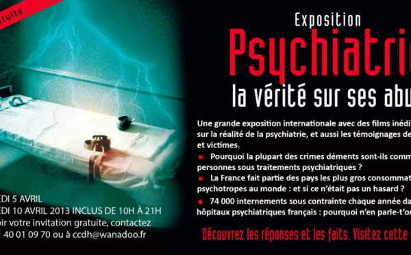 L'exposition de renommée internationale « Psychiatrie : la vérité sur ses abus » organisée par la Commission des Citoyens pour les Droits de l'Homme, ouvrira ses portes le jeudi 22 juillet 2010 à 10h au Salon des Miroirs – 13, passage Jouffroy dans le 9ème arrondissement de Paris, pour sensibiliser un maximum de citoyens aux dangers d'un projet de loi liberticide.
