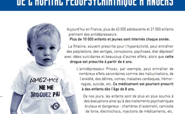 Des centaines de membres de la Commission des Citoyens pour les Droits de l'Homme manifesteront le samedi 8 février de 13h30 à 15h30 dans les rues du centre-ville d'Angers contre l'ouverture d'un nouvel hôpital pédopsychiatrique dans la région. Des prospectus seront distribués afin de sensibiliser les habitants aux dangers des internements psychiatriques, et une pétition pourra être signée contre l'ouverture de l'établissement. Le CESAME de Sainte Gemmes-sur-Loire a un projet de délocalisation du service infanto-juvénile sur le plateau des Capucins à Angers. Cet établissement de 7500 m2 verra le jour en mars 2014 et pourra accueillir des centaines d'enfants de 0-18 ans. Le projet est estimé à 15 millions d'euros. De nos jours, les enfants sont de plus en plus soumis à des...