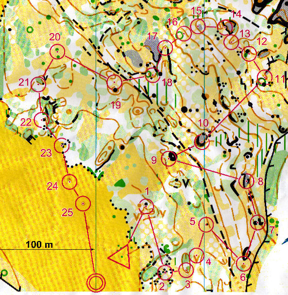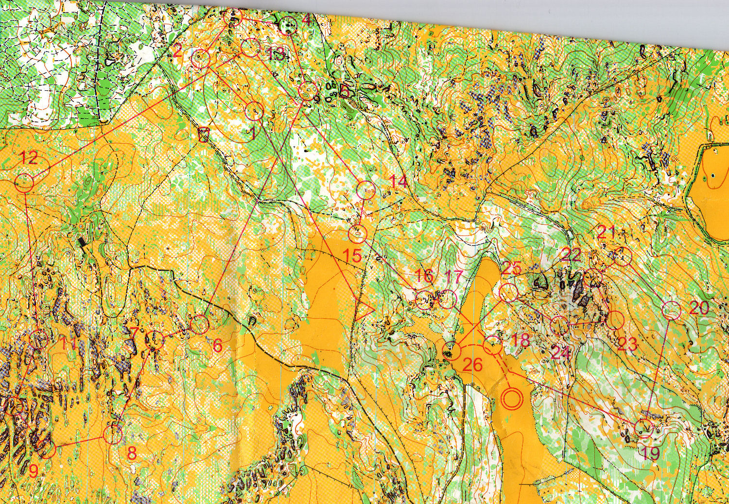 Du coup, ce fut un enchaînement de fautes, dès le poste 1 où je suis trop haute dans le flanc, même si j'arrivais à remonter à chaque fois sur la tête. Les postes 4 - 12 - 13 n'ont pas été parfaits, et j'ai décidé de me détacher un peu en voyant les autres filles partir sur la droite pour aller au poste 14. Finalement, j'arrive par le haut du poste, je passe à 10 m de ma dépression mais je doute et je vais me recaler pour être sûre de moi... et je revois le groupe... dommage, c'était l'occasion de faire ma propre orientation, ce que je préfère !