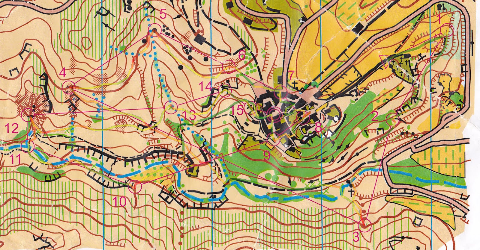 Pas super top partout, y'avait des meilleurs choix à plusieurs endroits (cf. rose), et en plus je fais PM... je vais du mauvais côté du mur à la 10 en lisant mal ma définition, et je pense que le poste n'y est plus... bref, PM, il va y avoir des choses à travailler dans la tête d'ici les sélections, même si un sprint de 19', j'ai vraiment pas l'habitude et que malgré ma vitesse de course pas top, je devais être un peu dans le rouge...