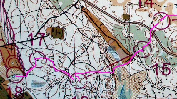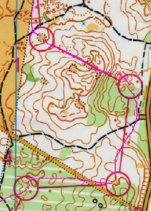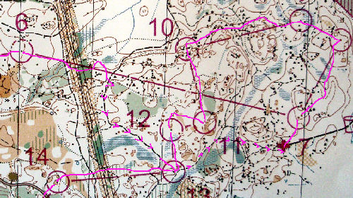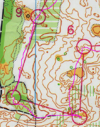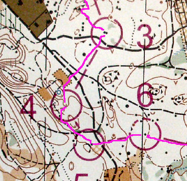 Pour aller au poste 5, l’itinéraire était nettement plus long, mais la limite de végétation était une superbe ligne directrice sur les 2/3 du trajet. Du coup, avec un petit relâchement sur cette portion, ça n’a pas loupé pour que le relief me semble plus diffus, et que j’aille côtoyer la colline à gauche de mon poste avant de revenir dessus.
