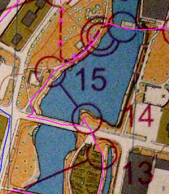 Enfin, de la 12 à la 13, 2 choix possibles, sans doute équivalents, mais avec des escaliers à descendre par la gauche comme sur mon tracé, ou en longeant la rivière et contournant la colline du poste 6 au large. Pour terminer sur les 3 derniers postes « roulants ».