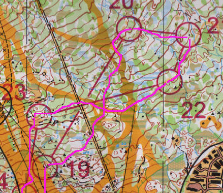 Je fais ensuite un autre 90° en sortant du poste 19 : à nouveau la pente que je devais passer, sans me soucier de la direction plus directe qui m’aurait épargné de la distance et une pente trop forte. Je choisis ensuite de passer par le layon, même si je n’optimise pas le dénivelé.