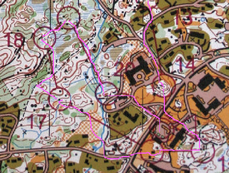 Au poste 13, c’est le début d’un petit bout de village, avec passage sur la zone d’arrivée et retour en forêt. Petite erreur en sortie de poste 17 qui me mène trop à gauche sur le chemin.
