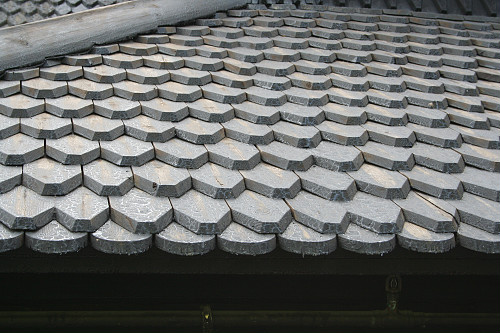 « où viennent s'insérer les murs ainsi que les tuiles entièrement en bois (même les clous pour tenir le tout sont en bois). »