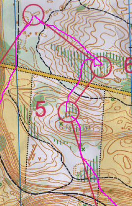 Pour aller au poste 5, 2 choix : éviter le dénivelé par l’Est ou partir tout droit en serrant les dents. Je pars à peu près tout droit, je pense que le choix est bon. L’attaque n’est pas « béton », en arrivant du sommet, mais je me recale bien et vois l’avancée du poste.