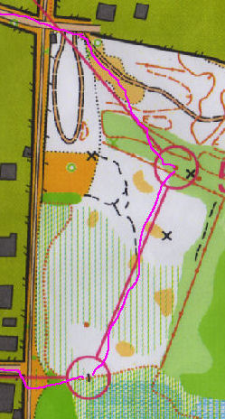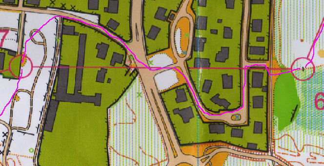 Après ces quelques postes en forêt, il ne fallait maintenant pas se relâcher, d’autant plus que ma sortie de poste, en voulant éviter le plus possible de frayer le chemin dans les ronces et donc en utilisant les traces existantes, me fait arriver à gauche de la route d’entrée dans le lotissement que je devais prendre. Certains sont partis vers la gauche en contournant le tout : ce n’était pas gagnant.