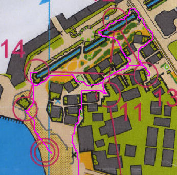 Enfin, Olivier, qui avait tracé ce très joli sprint, nous avait réservé le meilleur pour la fin, avec une succession de petits postes alors que la fatigue se fait sentir… Le choix 10-11 par la gauche, en faisant une entrée-sortie, était le meilleur. Je perds pas mal de temps sur l’avant-dernier poste : je pense qu’il fallait prendre directement en face pour traverser le canal sur le pont de l’ouest, et longer l’eau jusqu’au poste : par la gauche, un parking à vélos bouchait un peu le passage, le trajet faisait descendre les escaliers et faire plus de distance avec plus d’angles.