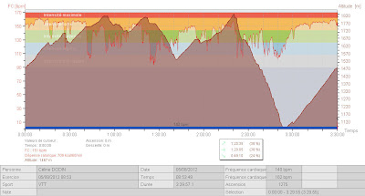 Finalement, je suis partie sur une bonne allure, en essayant de me temporiser et de ne pas trop m'enflammer, grâce au cardio pour me guider... c'était dur dans certaines côtes, plus habituée au rythme de CO où il faut relancer partout, j'avais tendance à vouloir aller trop vite je pense, mais rien qu'à penser à ce qui me restait à parcourir, ça me calmait un peu.