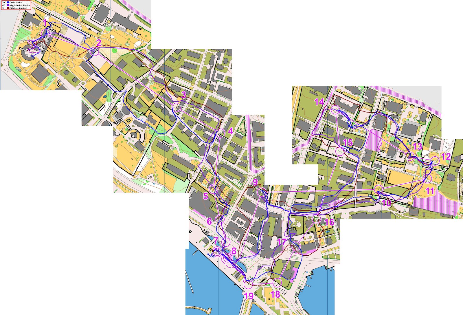 Et mon tracé GPS en bleu (désolée, quelquefois en ville le GPS perd les pédales, mais on n'arrive toujours pas à traverser les bâtiments je vous rassure), ainsi que celui de Simone NIGGLI (médaille d'or - en violet), et Annika BILLSTAM (médaille de bronze - en marron) :
