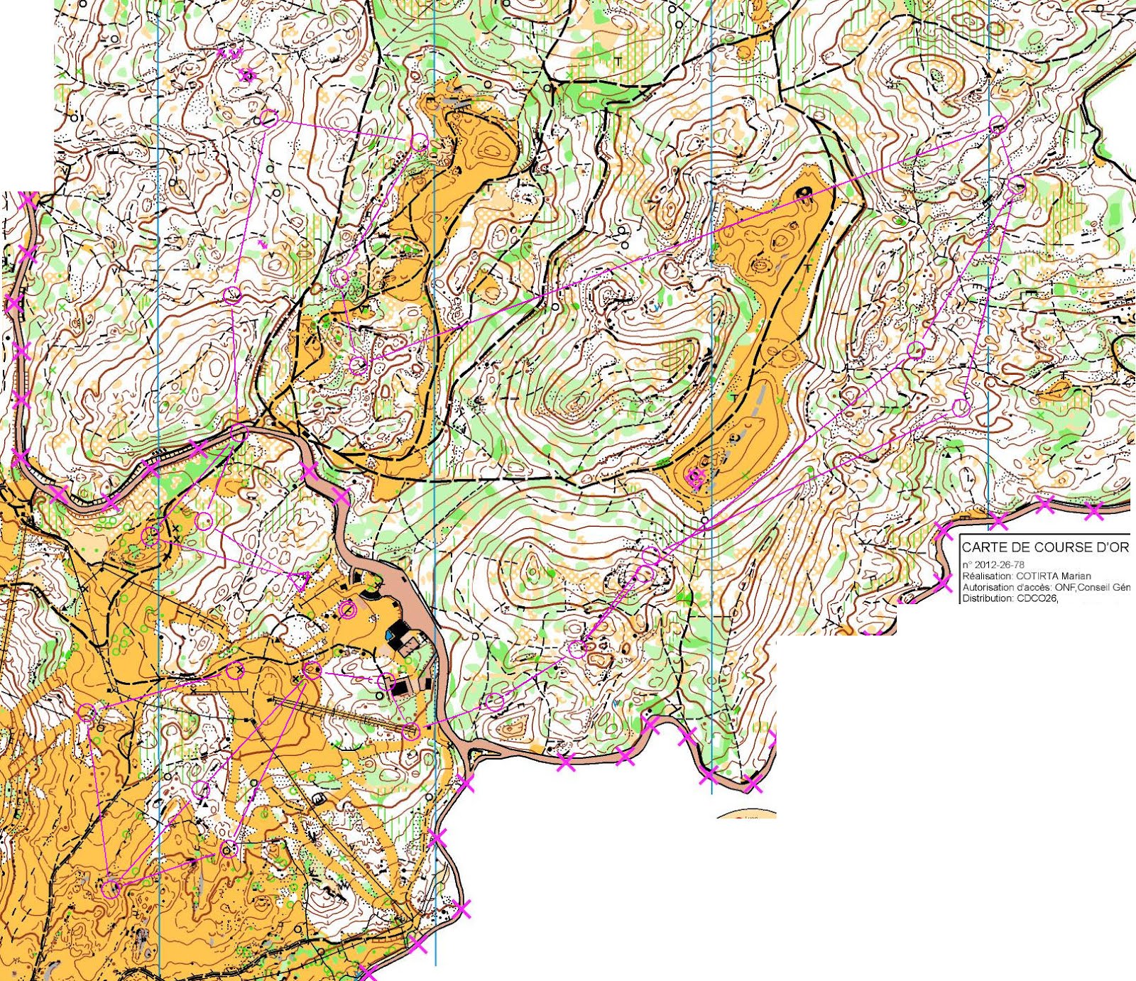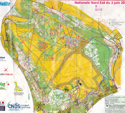 A l'échauffement, je trouvais que j'avais un peu plus les jambes que le matin... mais les neurones ont un peu moins bien fonctionné.... Je pars très mal - envie de trop bien faire ? - dès que je prends la carte, en passant à côté du 1er poste, en ne voyant pas un passage pour aller au deuxième poste sur ma carte (alors que je le voyais devant moi sur le terrain), et en faisant un très très mauvais choix pour aller au poste 3... du coup, plus d'1 mn de retard déjà au poste 3, malheureusement j'ai plié ma course d'entrée et il n'y avait plus rien à faire...