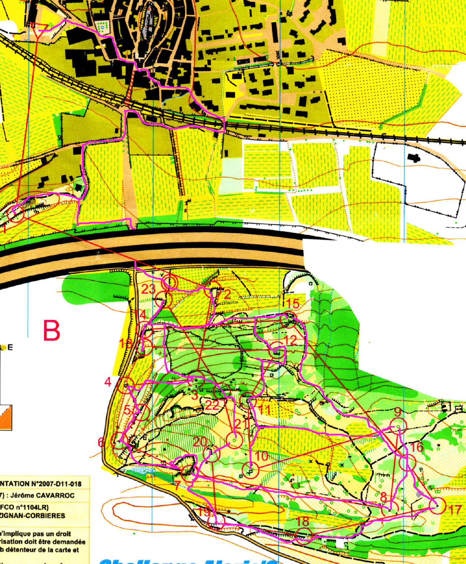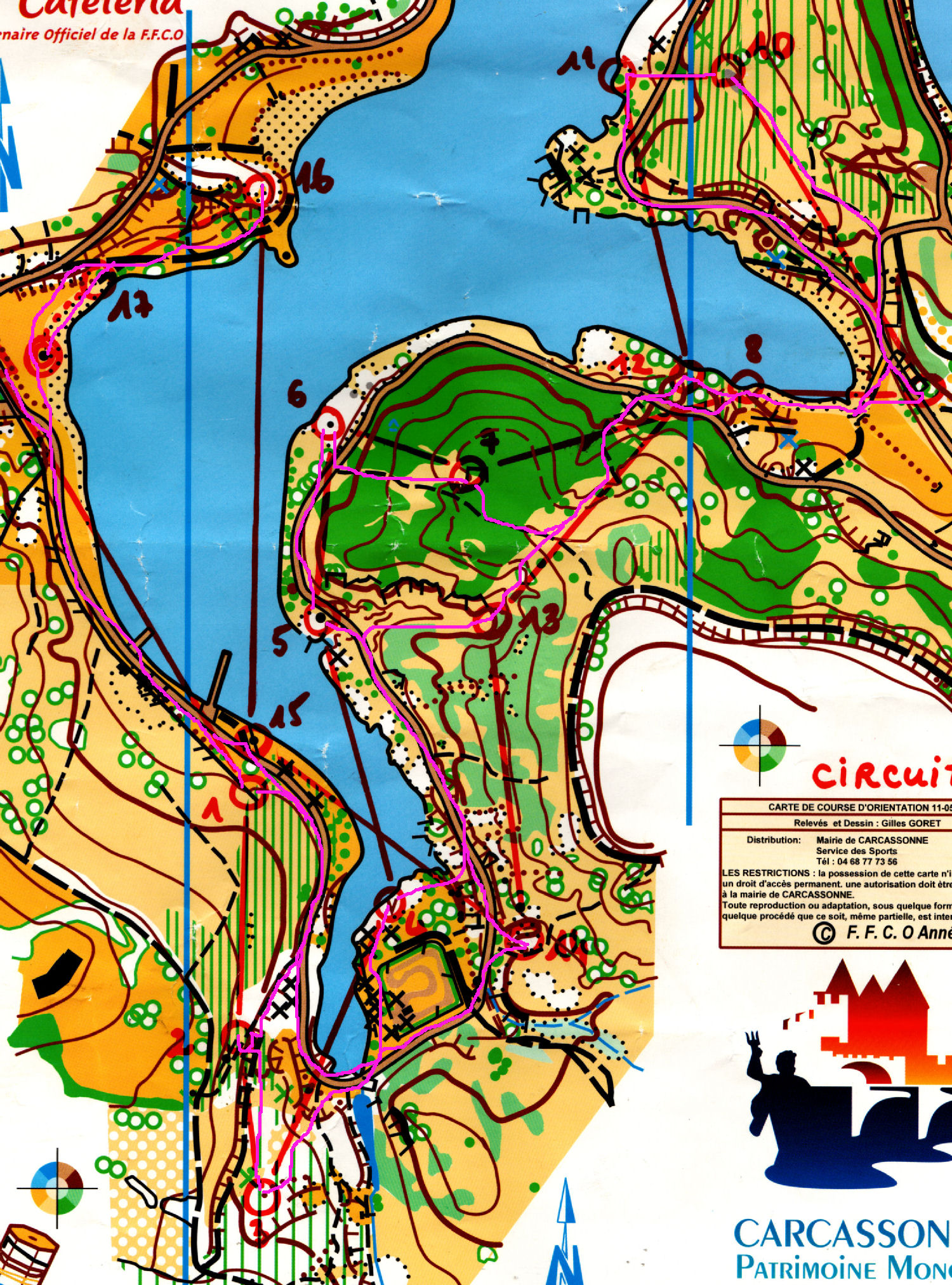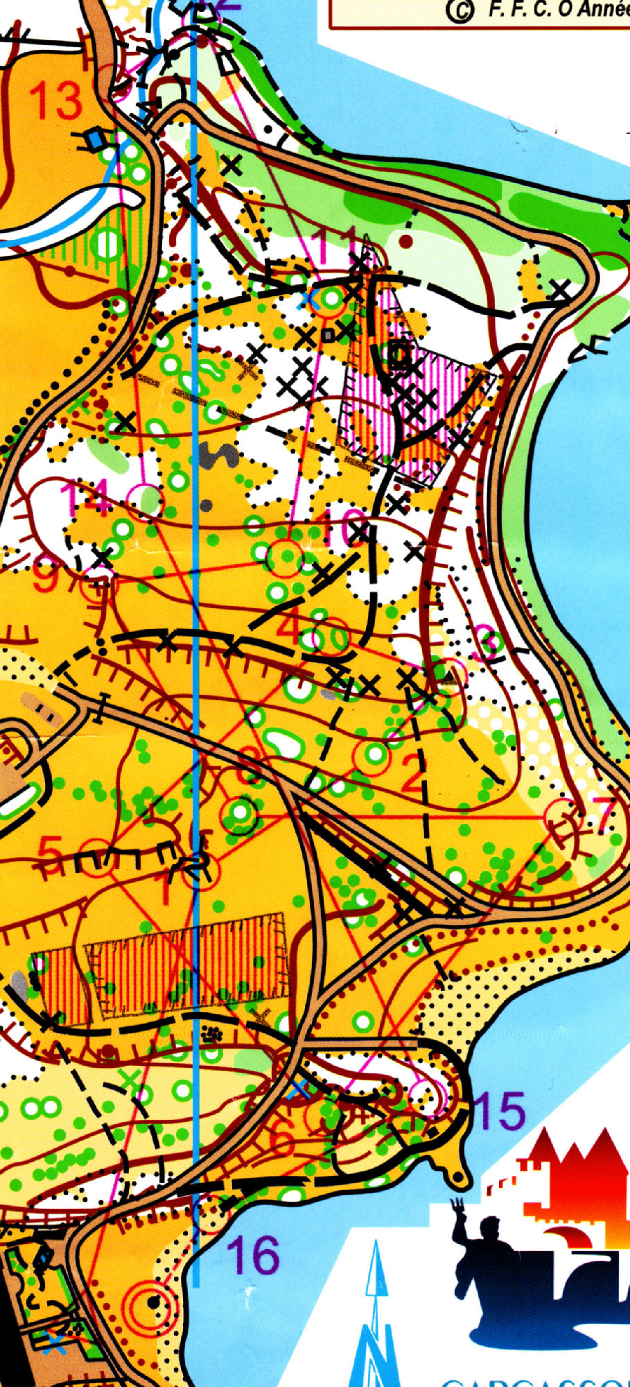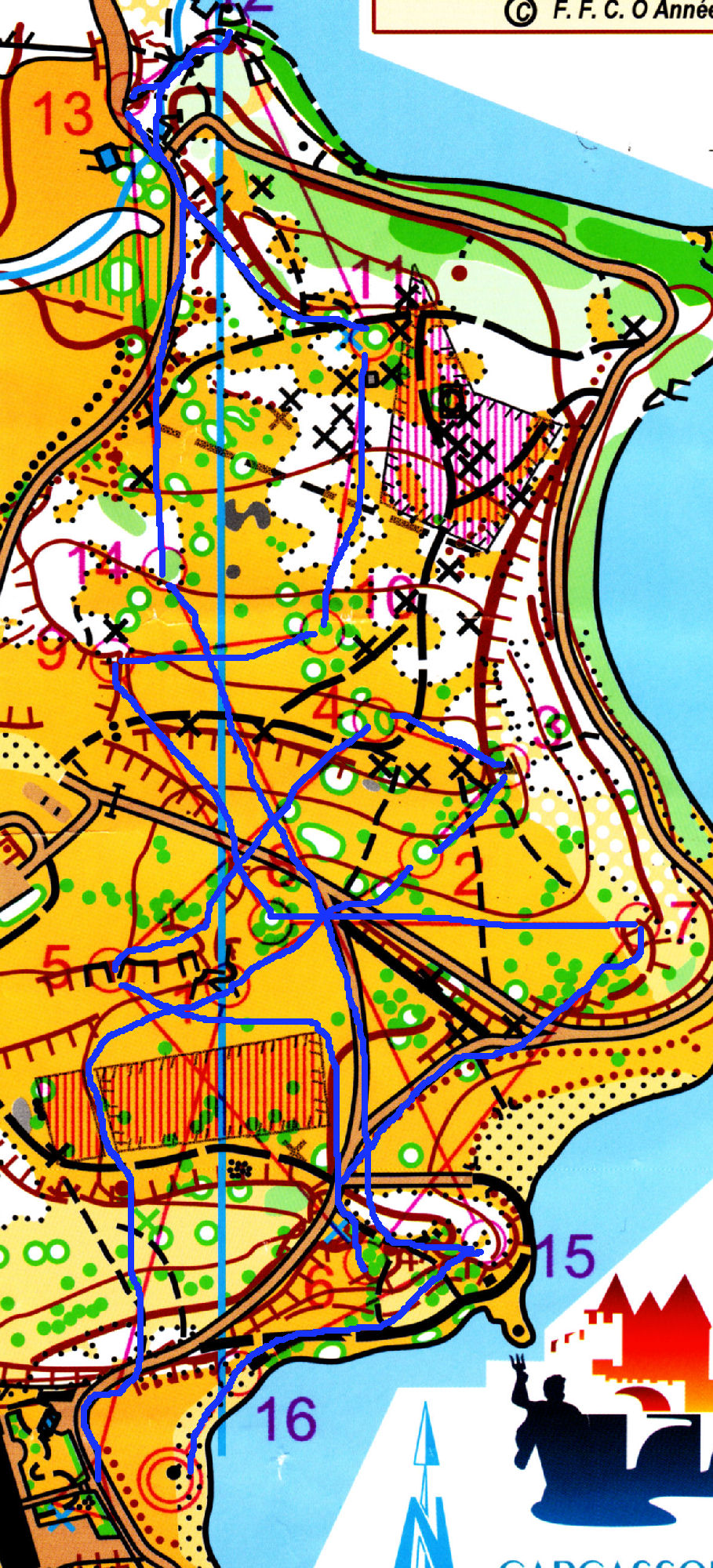 Premier sprint le samedi après midi, au plan d’eau de la ville de carcassonne. Un terrain très découvert, très bien choisi pour un sprint, un parc très joli. L’essentiel des trajets étaient rectilignes, en dehors des zones interdites, mais certains postes pouvaient être piégeux.