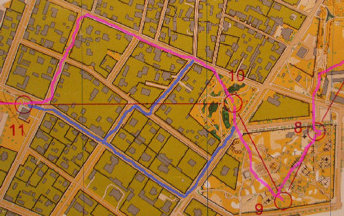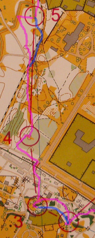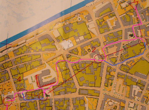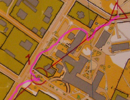 Dès le premier poste, je pars vers des bâtiments sans sortie (le passage, ou ce que je crois être un passage, est sous le trait rouge). Je lis un peu mieux ma carte et je fais rapidement demi-tour.