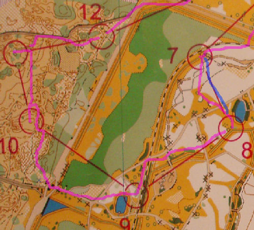J’ai ensuite eu pas mal de soucis, d’anticipation, de lecture, je n’étais pas à 100% dans ma course, comme j’ai pu l’être il y a 3 semaines au début du stage en Tchéquie sur la moyenne distance du camp d’entraînement officiel. Notamment, je vois bien qu’il faut longer la clôture entre 2 et 3, mais je ne le fais pas, je me laisse embarquer, et j’arrive en plus du mauvais côté de l’élément… sans commentaires.