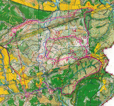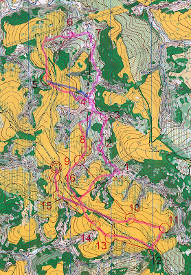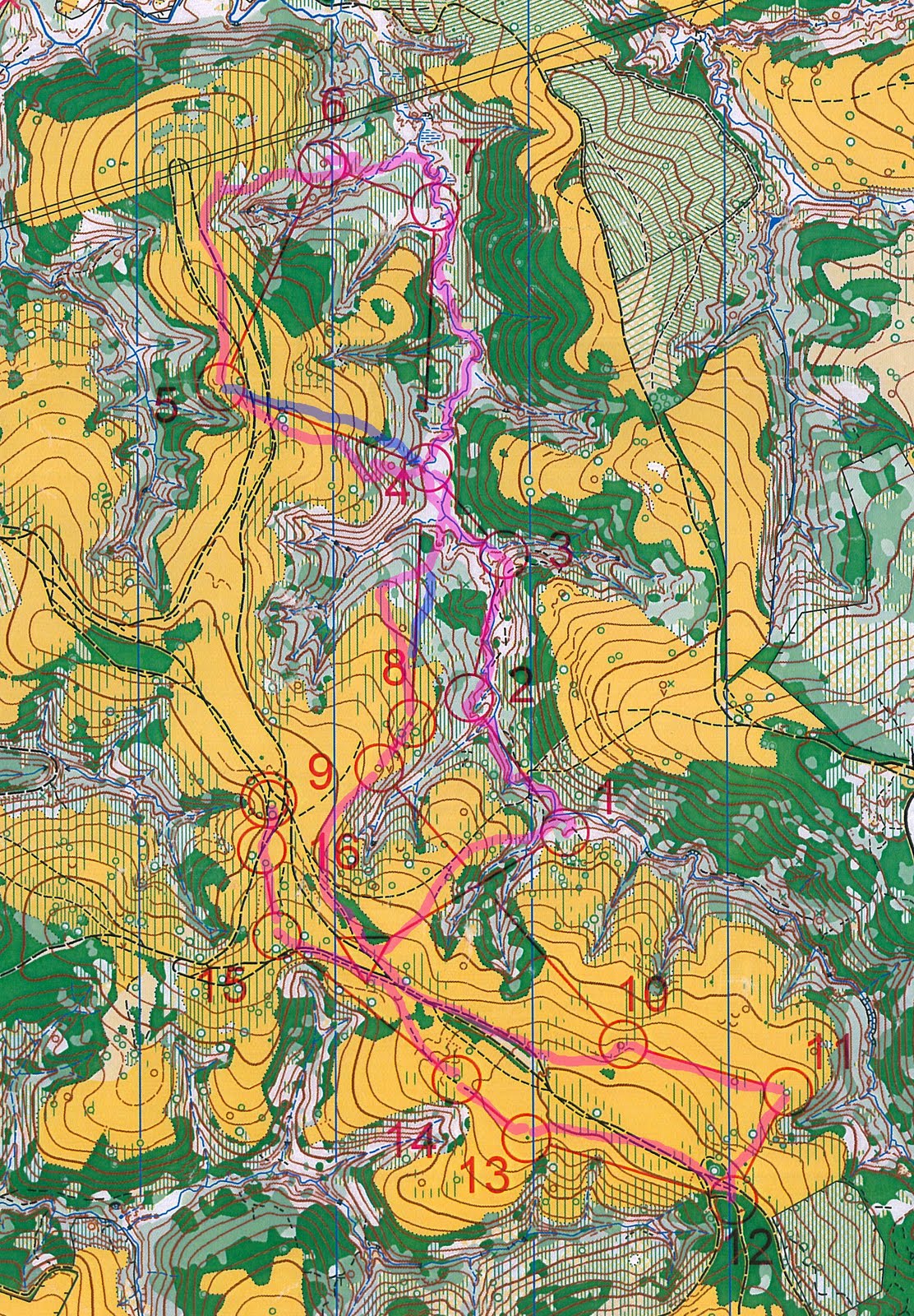 Je suis assez contente, malgré quelques endroits où j'ai bien dévié de mon itinéraire parce que je me suis faite entraînée par un chemin qui courait si bien (la peur de rentrer dans le vert 3 et de rester accrochée à une ronce une n-ième fois....) (poste 6), d'ailleurs quelques fois cela courait encore moins bien que dans le vert (approche du poste 1 : le jaune était couvert de fougères qui étaient plus grandes que moi !), et quelques attaques de poste ratées où je reviens en arrière (postes 4, 5, 15, d'ailleurs je ne comprends toujours pas comment j'ai pu rater le poste 15 en étant dans la pente au dessus de la rivière et en cherchant le poste).