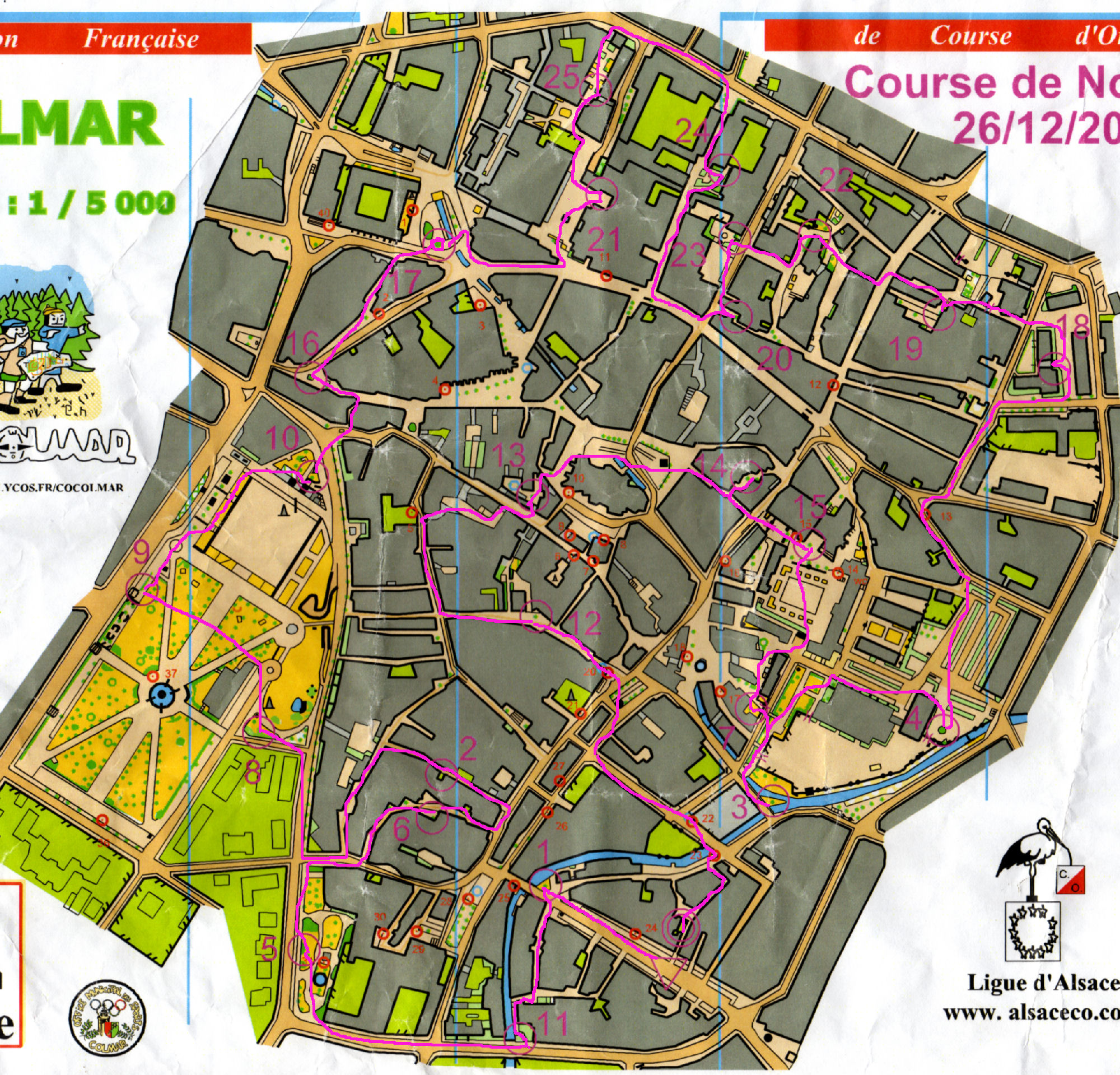 …L’inratable Course au Score de Nuit du Club d’Orientation de Colmar le jour de la Saint Etienne, férié en Alsace. Petite course dans le centre ville de Colmar, pour tous, certains venus découvrir le jeu de lumière qui est chaque année installé pour les fêtes, d’autres la course d’orientation, les derniers, en départ en masse à 17h sur la place devant l’office municipal des sports, venus en quête de balises pour faire un magnifique entraînement en préparation de la saison future.