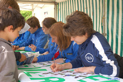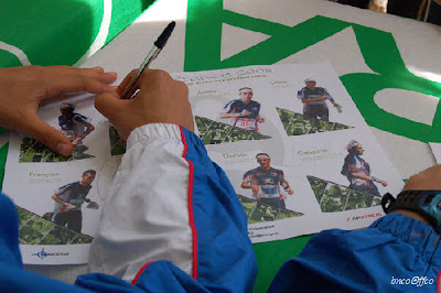 A peine le temps de se reposer, et tous les qualifiés au Championnat du Monde de République Tchèque de 2008 étaient conviés à une séance de dédicaces sur l’aire d’arrivée. Tous, c’était : Thierry, Vincent, Philippe, Capucine, Amélie et moi, Damien et François n’ayant pas pu faire le déplacement depuis leurs contrées nordiques lointaines. Ça a été un moment assez exceptionnel, très sympathique. L’occasion de voir plein de jeunes de tous horizons différents, de discuter quelques instants avec eux, d’échanger un sourire… Une magnifique idée, ça m’a rappelé le jour où la station de La Bresse avait accueilli une coupe du monde de ski alpin… et où nous attendions discrètement autour de l’aire d’arrivée avec nos petits carnets que ces skieurs que l’on voyait à la télé nous griffouillent un petit mot sympathique… que du bonheur !